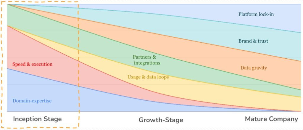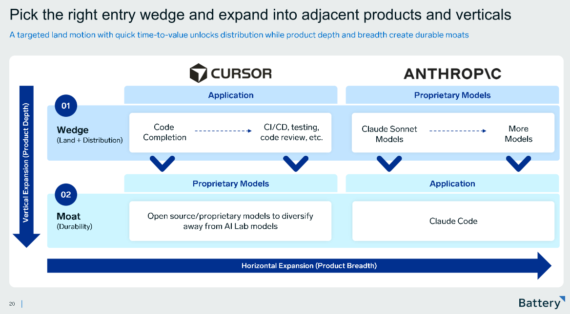Boa visualização das diferentes estratégias de wedge e próximos passos entre aplicações e plataformas, e qual moat cada um está buscando.