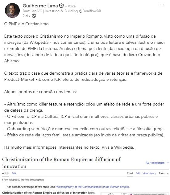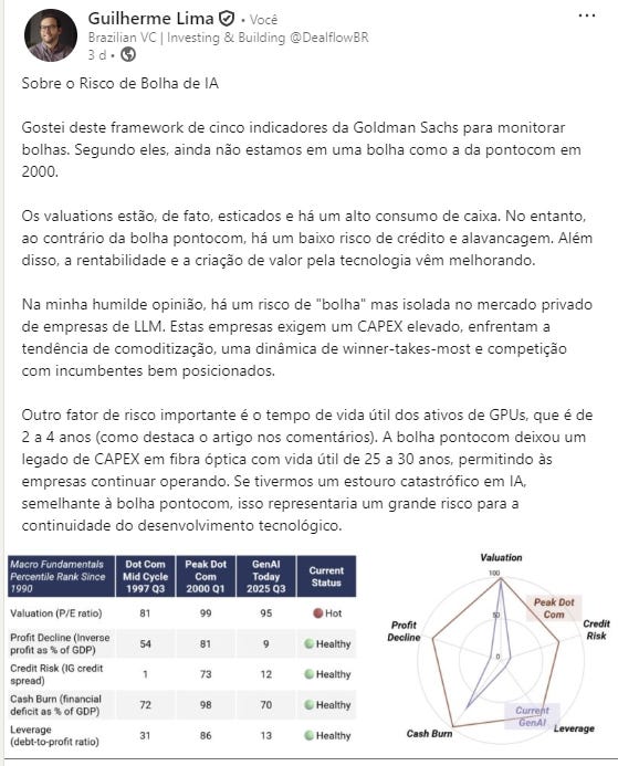 Olá, eu sou Guilherme, atuo como VC e apoio fundadores em early-stage. Na DealflowBR compartilho notas de campo, frameworks e curadoria para fundadores e investidores. O objetivo é separar o sinal do ruído na jornada de construção de startups. Todas as opiniões são exclusivamente minhas. Se quiser colaborar, me encontre no LinkedIn ou responda a este e-mail.