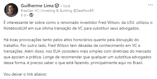 A DealflowBR é gratuita, sem anúncios, e o que me faz continuar escrevendo é ver o crescimento de leitores da newsletter e das interações, feedbacks. Se você gostou ou acredita que as informações geram valor, considere compartilhar essa edição em suas redes sociais ou com pessoas que poderiam se beneficiar.