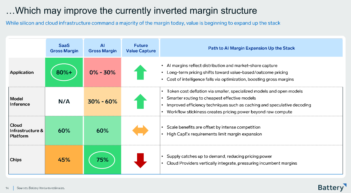 Esse slide abaixo mostra as margens dentro da cadeia de IA. Interessante como apenas a infraestrutura está capturando o valor, porém é esperado que isso comece a se inverter quando as ondas tecnológicas e o terreno da infraestrutura se estabilizarem.
